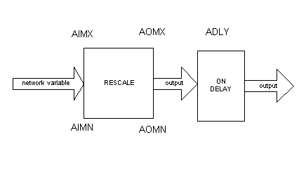 The Dessicant Wheel will only need to operate over a specified range of the input heat demand. this range is set using config variables AIMX (A block Input MaXimum) and AIMN(A block Input MiNimum) . The output from the re-scale block normally 0 to 100% is also scalable by setting the output scale parameters AOMX (A block Output MaXimum) and AOMN(A block Output MiNimum). So if the Dessicant wheel needs to run from zero speed at a heat demand of 30% up to 80% for a heat demand of 65% the re-scale parameters would be set as